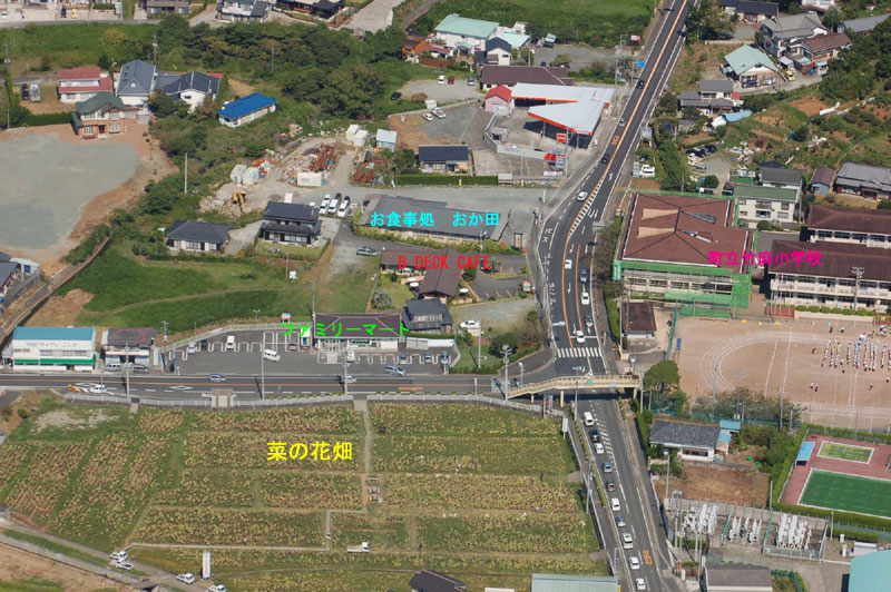 ↑日野交差点です。中心にコンビニ、右側に竹麻小学校が見えます。