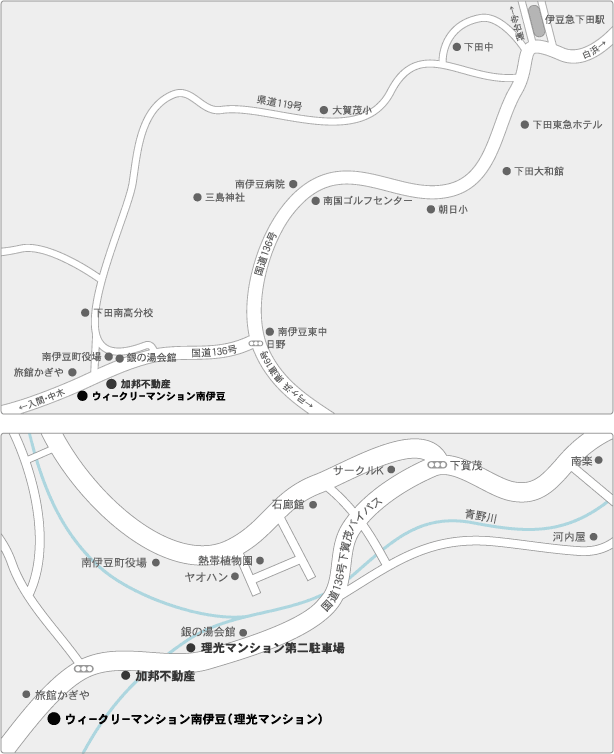 下田から国道136号線に入り南伊豆町方面へ。日野交差点で右折後3kmほど進むと町営温泉銀の湯会館が右手に見えます。そこから400m先左手がウィークリーマンション南伊豆です。