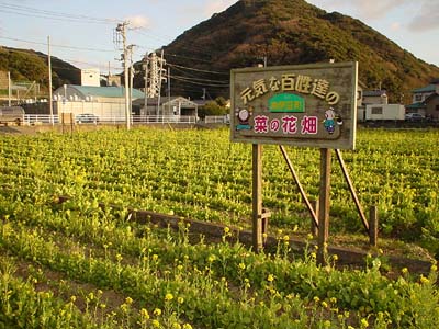 ↑日野の菜の花畑。2月〜3月には一面に花をつけ、まるで黄色い絨毯のように見事な景色です。